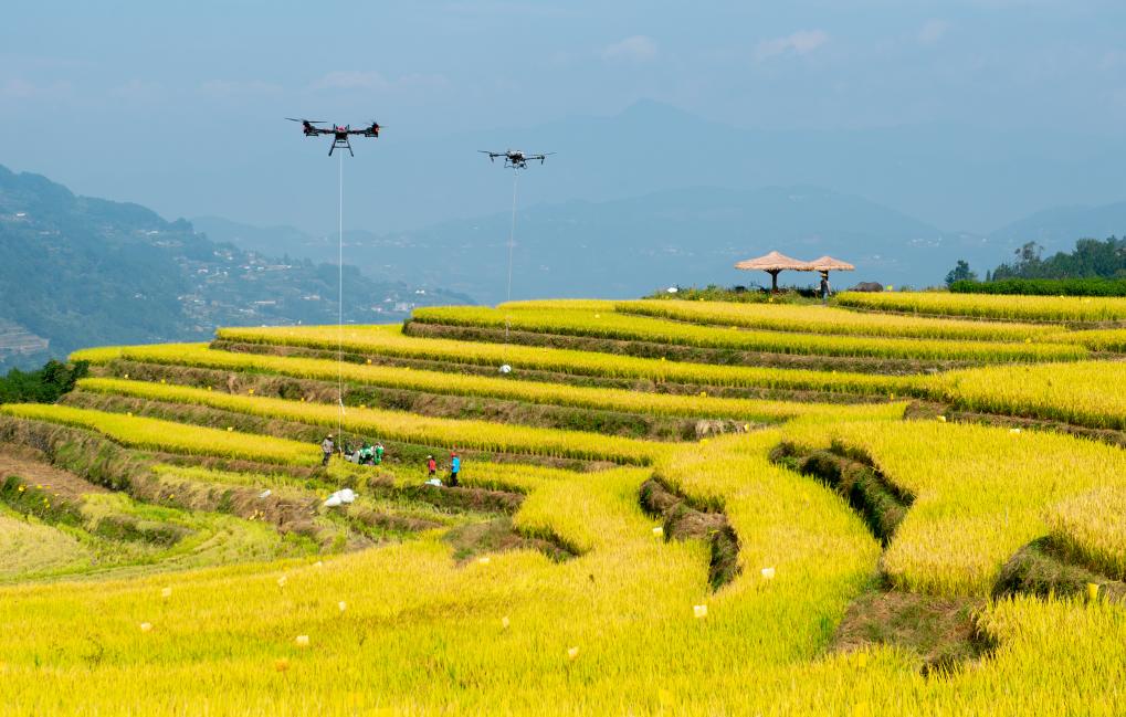 10月10日,湖北省秭归县沙镇溪镇长春村村民用无人机转运收获的水稻(无人机照片)。新华社发(雷勇摄)