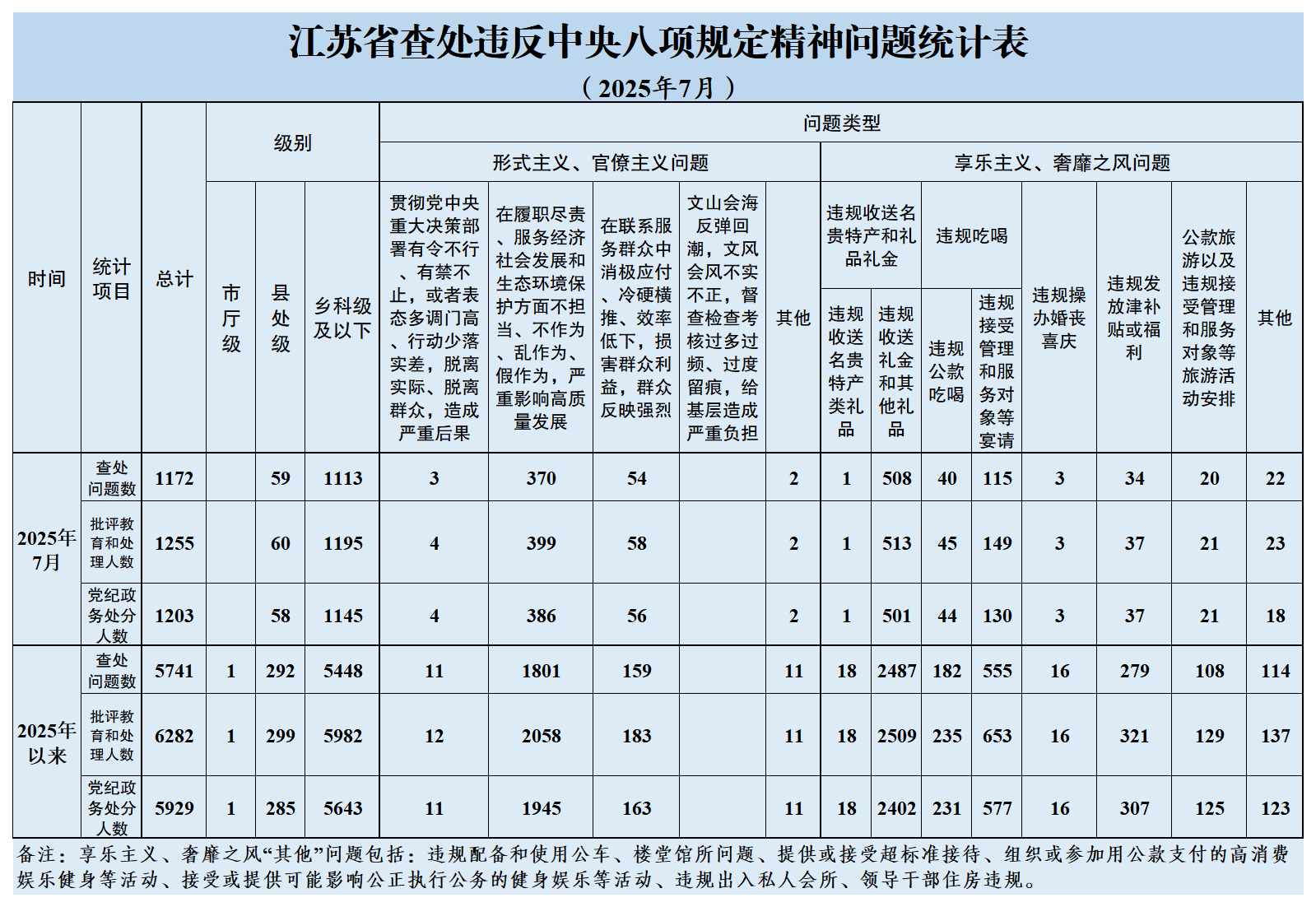 2025年7月,全省共查处违反中央八项规定精神问题1172起,批评教育和处理1255人、其中给予党纪政务处分1203人。从问题类型看,查处形式主义、官僚主义问题429起、批评教育和处理463人,查处享乐主义、奢靡之风问题743起、批评教育和处理792人。从人员级别看,批评教育和处理县处级干部60人、乡科级及以下人员1195人。