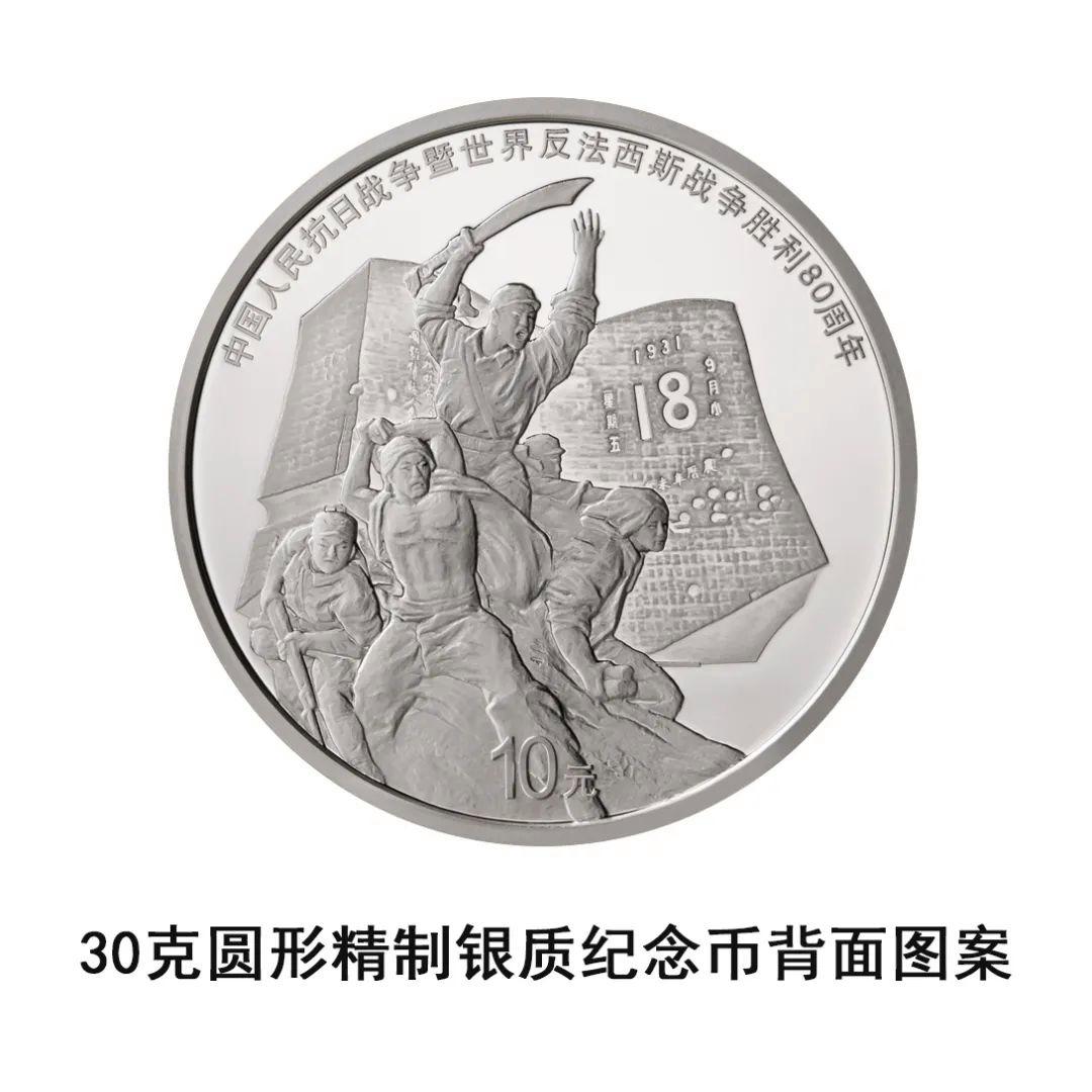 30克圆形银质纪念币背面图案由“大刀进行曲”雕塑、“九·一八”历史博物馆“残历碑”雕塑等元素构成,并刊“中国人民抗日战争暨世界反法西斯战争胜利80周年”字样及面额“10元”字样。