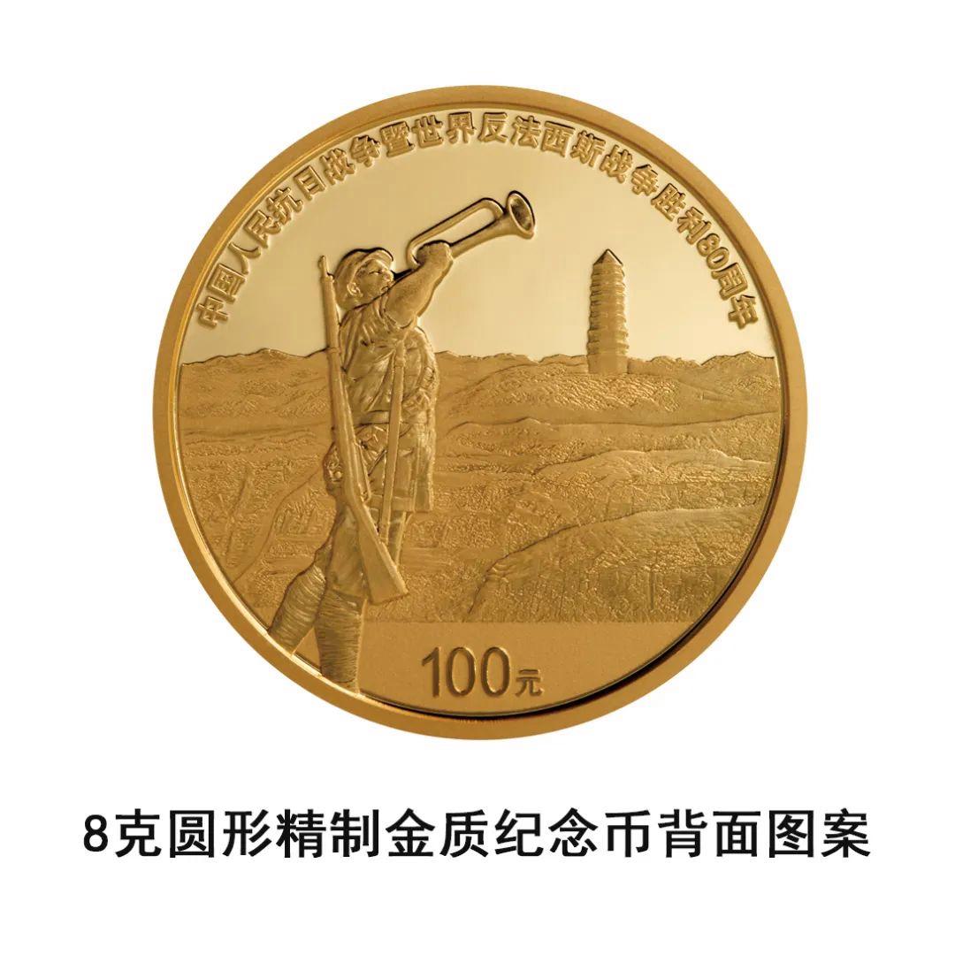 8克圆形金质纪念币背面图案由延安宝塔山、“胜利的号角响彻山河”雕塑等元素构成,并刊“中国人民抗日战争暨世界反法西斯战争胜利80周年”字样及面额“100元”字样。