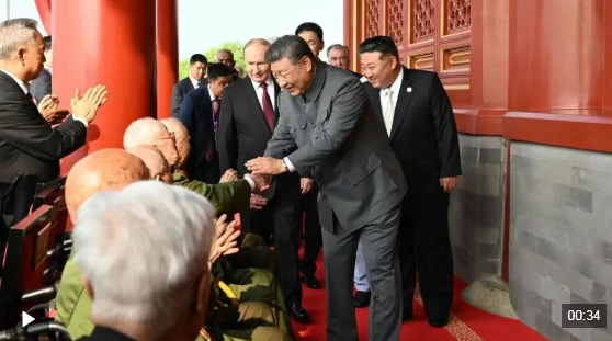 纪念大会开始前,习近平同抗战老战士老同志代表亲切握手,向他们表示崇高敬意。