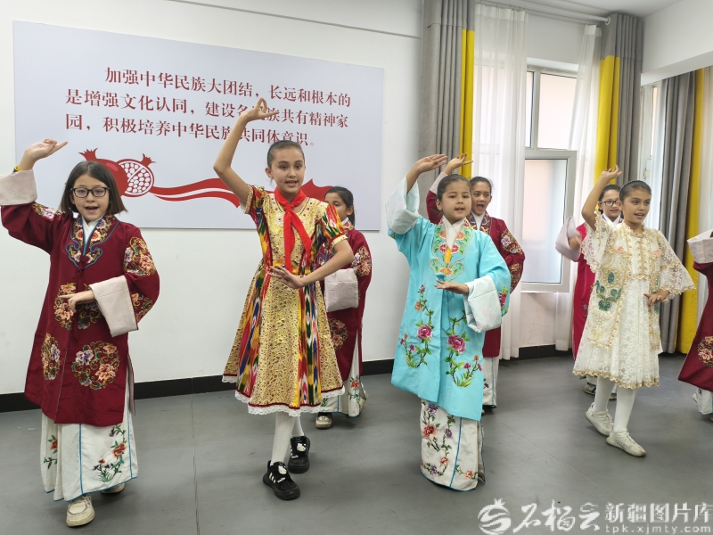 12岁的娜扎开提·帕尔哈提江(左二)放学后和小伙伴们在社区“小小少年宫”练习京剧唱腔。石榴云/新疆日报记者 冉虎摄