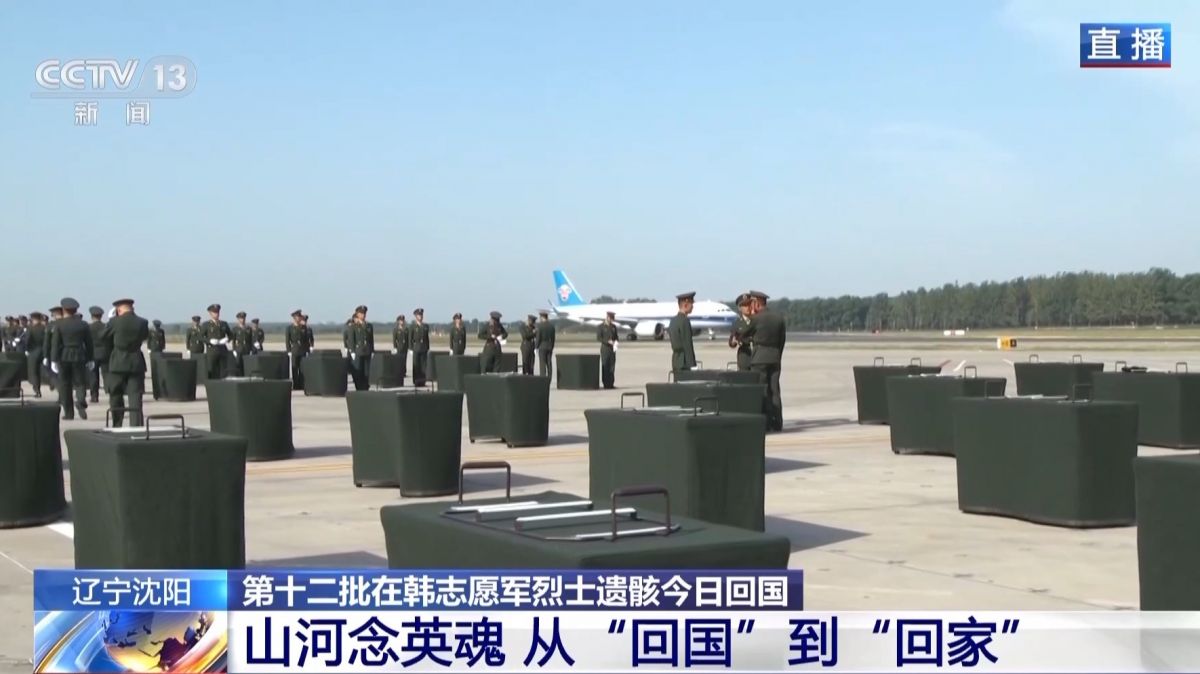 总台记者 杨海灵:沈阳桃仙国际机场的专机停机坪是举行第十二批在韩中国志愿军烈士遗骸迎回仪式的场地。稍后,搭载30位在韩志愿军烈士遗骸及其遗物的专机将在这里降落。