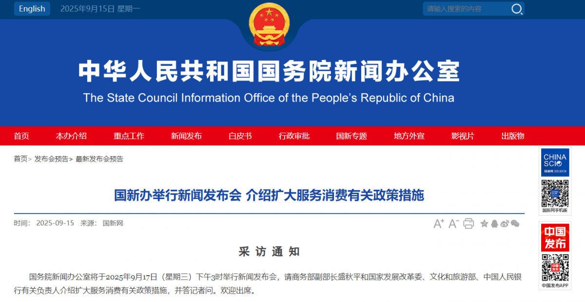据国务院新闻办公室消息,国新办将于2025年9月17日(星期三)下午3时举行新闻发布会,请商务部副部长盛秋平和国家发展改革委、文化和旅游部、中国人民银行有关负责人介绍扩大服务消费有关政策措施,并答记者问。