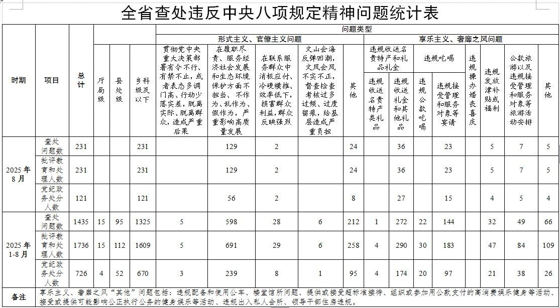 为持续加固中央八项规定堤坝,以严的基调、严的措施、严的氛围深入推进作风建设常态化长效化,现将2025年8月全省查处违反中央八项规定精神问题有关情况通报如下: